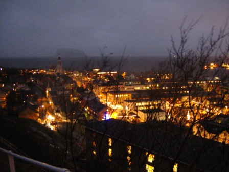 Aber erst musste ich ja hier herfinden. Und weil nur Busfahren ja langweilig ist, hab ich einfach ein Stück die Hurtigrute genommen, die jeden Tag unter meinem Fenster vorbeituckerte. Am 13.12. um 18.30 Uhr: